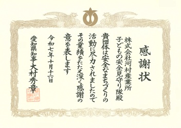 当社子どもの安全見守り隊が行っている安全なまちづくりの活動について感謝状をいただきました。